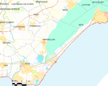 The centre of the village lies within the lines of the old walls. There is a hotel and a number of cafes and restaurants. Marseillan Plage is a purpose-built holiday resort on the Mediterranean, some 3 km (1.9 mi) from Marseillan Ville.