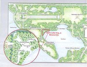 The Martin Luther King Jr. Memorial is located in West Potomac Park in Washington, D.C., southwest of the National Mall.[1] The national memorial is America's 395th unit in the National Park Service.[2] The monumental memorial is located at the northwest corner of the Tidal Basin near the Franklin Delano Roosevelt Memorial, on a sightline linking the Lincoln Memorial to the northwest and the Jefferson Memorial to the southeast. The official address of the monument, 1964 Independence Avenue, S.W., commemorates the year the Civil Rights Act of 1964 became law.[3]