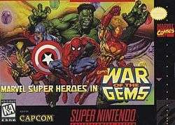 Marvel Super Heroes: War of the Gems (マーヴルスーパーヒーローズ ウォーオブザジェム Māvuru Supā Hīrōzu: Wō obu za Jemu) is a 2D action platformer video game developed by Capcom for the Super Nintendo Entertainment System, based on the events of Marvel Comics' series, Infinity Gauntlet. In the game's plot, Adam Warlock calls upon Earth's greatest superheroes to seek out the Infinity Gems before they fall into the wrong hands.