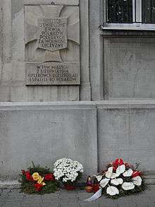 Around 40 Poles were murdered in the Jesuit monastery on Rakowiecka Street on 2 August 1944. Among them were eight priests and eight religious brothers of the Society of Jesus,[lower-alpha 2] at least eight women and a 10-year-old altar boy.[9][10] Polish historians were able to identify 32 victims of the massacre.[9]