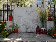 In the 1950s victims of the massacre were commemorated with two commemorative plaques. One of them, designed by sculptor Karol Tchorek, is displayed on the wall of monastery (facing Andrzej Bobola Street). Second is a free-standing one located near the church’s fence on Rakowiecka Street.[16]