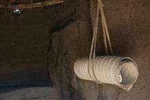 Very popular among the Bedouin Manasir is the Qirbah (قربة), a hose made from the entire skin of a goat. Filled with a liquid it becomes moist and flexible. The Qirbah is hung in a shady windy place, either from the ceiling, a beam or on a wooden tripod. Due to constant evaporation its content is cooled down considerably. The riverain Manasir employ the Qirbah primarily for cooling fermented milk since their water is cooled in huge permeable earthen jars called Sir (زير). These jars are placed in the shadow of a tree or lined up in a row in isolated covered mud structures called Masirah (مزيرة).