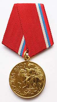 The Medal "In Commemoration of the 850th Anniversary of Moscow" (Russian: Медаль «В память 850-летия Москвы») is a state commemorative medal of the Russian Federation created to denote the 850th anniversary of the city of Moscow. It was established on February 26, 1997 by Presidential Decree № 132.[1] Its statute was defined on March 21, 1997 by Presidential Decree 223.[3]