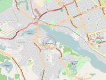 Melville Island is part of the Halifax Regional Municipality, on the southeast coast of Nova Scotia. The peninsula lies on the eastern boundary of Melville Cove in the Northwest Arm, an inlet between the Halifax Peninsula and Mainland Halifax.[1][2] It has a total area of approximately 2,000 square metres (22,000 sq ft).[3] Melville Island is 200 metres (660 ft) west of Deadman's Island, and southeast of Regatta Point.[4] The peninsula lies on a fracture zone trending northwest–southeast, and is located at the border between the Halifax Slate Formation and a granite-based formation. There is evidence of glacial scouring in the area. The surrounding seabed ranges from gravel to muddy gravel, and the shore is rocky.[2]