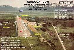 Merle K. (Mudhole) Smith Airport (IATA: CDV, ICAO: PACV, FAA LID: CDV) is a state owned, public use airport located 11 nautical miles (13 mi, 20 km) southeast of the central business district of Cordova, a city in the Valdez-Cordova Census Area of the U.S. state of Alaska which has no road access to the outside world.[1] Airline service is subsidized by the Essential Air Service program.