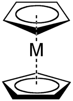 In the structure shown at right, the two pentagons are the cyclopentadienyl anions with circles inside them indicating they are aromatically stabilized. Here they are shown in a staggered conformation.