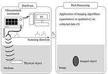 To increase cross-range resolution of the imaging system, several antennas should be distributed over an area (which is called sampling area) with a spacing less than the operating wavelength. However, by having several antennas placed close to each other, the mutual coupling between antennas may degrade the accuracy of the collected signals. Moreover, transmitter and receiver system will become very complex. To address these problems, one single scanning antenna is used instead of several antennas. Later, when the antenna finishes scanning the entire sampling area, one can put together collected data all over the sampling area and process them together, simultaneously. In fact, a synthetic (virtual) aperture is produced by moving the antenna (similar to synthetic aperture radar principle[5]). Later, the collected data, which is sometimes referred to as raw data, is fed into the software for processing. Based on applied processing algorithm, microwave imaging techniques can be categorized as quantitative and qualitative.