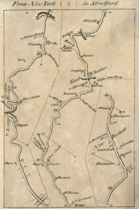 A school had been established just above the present Paine Avenue before the Revolution, and in 1809 it was removed to the junction of Eastchester Road. There being no public school law in the State of New York in force at the time, this new "Middle School" was erected by popular subscription pursuant to a resolution adopted by the citizens living within the hamlet, many of whom contributed the necessary labor, materials and financing. Upon the enactment of a new school law by the State in 1812 it was appropriated for a legalized public school for the hamlet. By 1815 the' Middle School District' boundaries were laid out, significantly extending the town limits of "Middletown". [7] The school was removed out of the hamlet in 1829 to a new building on Mechanic Street, and, from that point on, the growth of the Village of New Rochelle along the Turnpike Road (now Main Street) came at the expense of other parts of the town. "Middletown" gradually lapsed back into a farming district.[8]