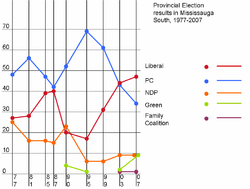 Once one of the strongest bastions of PC support in the province (winning 61% of the vote as recently as 1999), and certainly in the Toronto area, Mississauga South provincially has become more and more Liberal in last election cycles, which can be attributed to the demographics of Mississauga South changing, with more socially-liberal-minded young families moving from Toronto into the area, and increasing ethnic populations which are usually Liberal friendly. Prior to Tim Peterson's very narrow upset victory in 2003 (despite a Liberal landslide province-wide, most pundits had predicted PC incumbent Margaret Marland would hold on to the seat), the area had not voted Liberal provincially since Confederation, and the PCs generally held the riding fairly easily (with some exceptions such as the 1987 election, which the PCs won by less than 1000 votes). The riding was one of the most watched in the 2007 election, as it was expected to be one of the closest races in the province. The voters, however, differed from expectations, handing Liberal Charles Sousa a more than 5000-vote victory, as the PC vote fell almost 9% from 2003, which many viewed as a rejection of the automatic installing of floor-crossing Tim Peterson as the PC candidate. The Liberals and particularly the Green Party received the benefit of angry PC voters, seeing a 3% and a 6% rise in voting percentage, respectively.