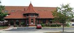 The Missouri, Kansas, and Texas Railroad Depot popularly known as Katy Station was built in downtown Columbia, Missouri in 1909 by the Missouri–Kansas–Texas Railroad. The station was one of two train stations serving Columbia in the 20th century, the other being the Wabash Railroad Station and Freight House constructed the same year.[2][3] The building is the terminus of the MKT Trail, a rails-to-trails project that was built on the former spur of the railroad. Having housed a popular local restaurant named "Katy Station" after the building, it now houses a bar name "Shiloh's."[4]