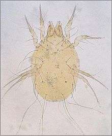 Infestation of the outer skin is typically caused by psoroptic mites. Psoroptes ovis is an example, it infests sheep and cattle. Other common psoroptic mites are in the genera Chorioptes and Otodectes. Psoroptic mites as adults are just large enough to see with the naked eye and can crawl rapidly using long legs. Psoroptes ovis infests the superficial layers of the skin, among the dead cells of the stratum corneum. Irritation of the outer skin by the mite's mouthparts and saliva results in cutaneous hypersensitivity and inflammatory exudation of serum and fresh cells. The mites feed on this exudate.[2] The skin loses its hair at the sites of infestation and large flakes of dried serum and cells accumulate. The mites cause intense pruritus (itching) and the host will groom compulsively and may become severely distressed.[3][4] Depilation (hair loss) may be substantial. Psoroptes ovis infests sheep worldwide and can be a serious welfare and animal production problem, mainly for sheep, but also cattle. Psoroptes cuniculi infests rabbits, mainly on their outer ear. Chorioptes bovis infestations are found on cattle, sheep and horses but do not cause the severe reactions associated with Psoroptes mites. Otedectes cynotis infestations on the outer ear of dogs are a common problem.