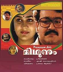 Mithunam (Translation: Title refers to a month in the Malayalam calendar) is a 1993 Indian Malayalam family drama film directed by Priyadarshan and written by Sreenivasan. The film stars Mohanlal and Urvashi in the lead roles. The film was produced by Mohanlal under the banner of Pranavam Arts and was distributed by Pranamam Pictures.[1]