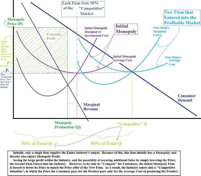 Introducing new Competition in what was previously a monopoly removes monopoly profit. Only 2 Firms are shown here to make Illustration of the additional Competition easier in a Graphical Presentation. In Normal Circumstances, it takes more than 2 firms to form a Competitive Situation, and having only 2 firms forms a "Duopoly (See Oligopoly)"