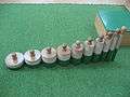 - Two boxes, each containing six cylinders. One set has a red top and the other a blue top. When shaken, each cylinder of the same color gives off a different sound. The sound from the red cylinder is matched with the same exact sound from the blue cylinder.
