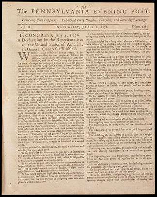 - A copy of the first newspaper printing of the Declaration of Independence, printed by the Pennsylvania Evening Post on July 6, 1776[14]