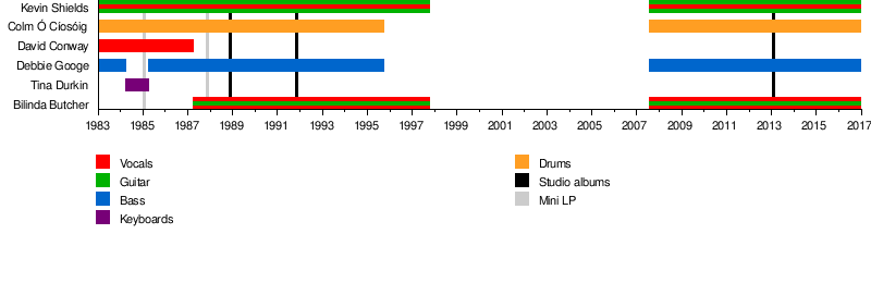 My Bloody Valentine are an Irish rock band formed in Dublin in 1983. Since 1987, the band's lineup has consisted of founding members Kevin Shields (vocals, guitar) and Colm Ó Cíosóig (drums), with Bilinda Butcher (vocals, guitar) and Debbie Googe (bass). The group are known for their integration of noise, melody, and unorthodox guitar and production techniques. Their work in the late 1980s and early 1990s resulted in their pioneering a musical style known as shoegazing.