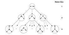 Schreiber and Schwöbbermeyer [12] proposed an algorithm named flexible pattern finder (FPF) for extracting frequent sub-graphs of an input network and implemented it in a system named Mavisto.[23] Their algorithm exploits the downward closure property which is applicable for frequency concepts F2 and F3. The downward closure property asserts that the frequency for sub-graphs decrease monotonically by increasing the size of sub-graphs; however, this property does not hold necessarily for frequency concept F1. FPF is based on a pattern tree (see figure) consisting of nodes that represents different graphs (or patterns), where the parent of each node is a sub-graph of its children nodes; in other words, the corresponding graph of each pattern tree’s node is expanded by adding a new edge to the graph of its parent node.