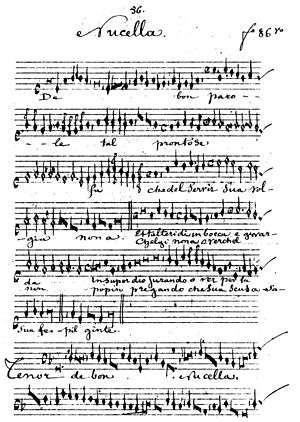 Nicolaus Ricci is known as the composer of a single, extant piece, De bon parole. It is attributed to "Nucella" on folio 86r in its single source, the manuscript Strasbourg M222 C22 (destroyed in 1870 by a fire started by a bombardment in the Franco-Prussian War[9] but surviving in a copy by Edmond de Coussemaker now in Brussels).[10] The attribution to "Nucella" was thought to be a corruption of the word "Micinella", the title of a Gloria by Antonio "Zachara" da Teramo and thus a possible work of Zachara's.[11] The new biographical evidence invalidates this theory, and some stylistic similarities can be explained by both composers being active in Rome in the Papal Chapel at the same time. This three-voice piece is in tempus imperfectum cum prolatione minori (2