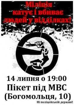 - July 14 - another protest action took place near the building of Ministry of Internal Affairs in Kiev. It was caused by that policemen who killed Indylo were not punished, policemen beat journalists in Zaporizhia had too soft punishment, activists protecting Park of Maxim Gorky in Kharkiv were arrested, illegal obstructions to protest actions and journalist activities by police.