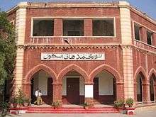 In 1858 British Government established Hyderabad High School in Sindh , and well known educationist Marahatta Dr. Bhandarkar was called and appointed as a Headmaster of School.[11] Latter in 1930, Noor Mohammad High School was upgraded & named it Noor Muhammad High School. It was the second highest school for Muslims in Sindh. Noor Mohammad Lakhir wrote to Aligarh to seek the services of some Muslim teachers for the school.[12] The building of Noor Muhammad High School was constructed in 1933.[13][14]