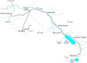 Main line: Dinas - Tryfan Junction - Waunfawr - Bettws Garmon - Snowdon Ranger - South Snowdon/Rhyd Ddu (approx. 9 miles).