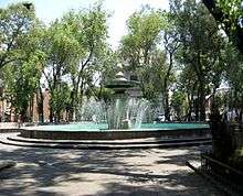 In the 1880s, the plaza received a fountain to function as a source of water for the neighborhood. Later lighting was installed. A market dedicated to iron and glass was installed here, but it was later moved to the San Cosme Market.[3] In 1925, the fountain that was located at the intersection of Bucareli and Barcelona, created by Manuel Tolsá, was put here to replace the old one. In 1968, the plaza was extensively remodeled, causing the destruction of the very first synagogue ever built in Mexico. It used to be on the south side of the plaza and was built in 1934. The Tolsá fountain was restored at this time, the surrounding houses and the side facade of the Church of Santa Teresa la Nueva were demolished to extend the plaza.. To the south of the plaza a statue of writer and educator Erasmo Castellanos Quinto (1880–1955) was placed.[3]