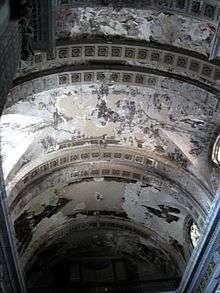 Inside the central nave is large, too, measuring 2,800 meters squared and 30 meters high"[6] At the back of this nave is a rotunda, illuminated by windows in the cupola. However, this light does not reach the vestibule. One major difference with the inside of this church is that there is no main altarpiece in the rotunda area.[4] Another noticeable “feature” is that the ceiling of both the cupola and the nave are almost completely bare of decoration, as almost all of it has deteriorated due to humidity and cracking from the structure’s uneven settling.[6]
