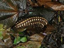 Nyssodesmus python also known as the python millipede or large forest-floor millipede is a species of flat-backed millipede of the family Platyrhacidae commonly found in Costa Rica, where it occurs widely and is locally abundant in the Caribbean slopes from sea level to around 365 meters (1,200 feet) in elevation.[1][2] Individuals reach lengths of up to 10 cm (4 in), and are conspicuously colored in yellowish tan with brown or black stripes. These millipedes are often encountered in pairs, with the male straddling the back of the female long after mating, to prevent other males from fertilizing the female's eggs before she lays them.[3]