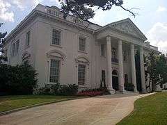 The Old Louisiana Governor's Mansion is located at 502 North Blvd. between Royal and St. Charles Streets in Baton Rouge and was used between 1930 and 1961; a new residence was completed in 1963. When the original Louisiana Governor's mansion was termite-infested during the beginning of Huey Long's governorship, Long decided to build a new one on the site. This governor's mansion is modeled after the White House in Washington D.C. supposedly because Governor Long wanted to become familiar with Washington's White House.[2] During the construction of this new governor's mansion Huey Long refused to move into the original one. Instead after his inauguration Long stayed at the Heidelberg Hotel in Baton Rouge while his family stayed back home in Shreveport.[3]