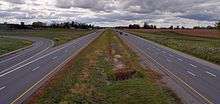 Highway 402 was widened in the Sarnia area from four to six lanes due to extensive traffic backups from the bridge crossing towards the USA; the westbound lanes were widened by two lanes, while eastbound capacity remains unchanged. The new four-lane roadway is divided into specific lanes for cars, trucks, local traffic, and NEXUS card holders.[37] The new lanes begin just before the Murphy Road overpass with a local lane breaking away for interchange access; all travellers wishing to exit the highway from this point must be travelling in this lane.[38] Construction began August 4, 2009,[21] between the Blue Water Bridge and Lambton County Road 26 (Mandaumin Road) and included the reconstruction of several bridges, as well as completely rebuilding the Christina Street exit to accommodate southbound access. Work was completed by the end of 2012.[37][38] Between 2004 and 2013, the speed limit along the westbound lanes from Airport Road westward were reduced from the standard 100 kilometres per hour (60 mph). However, following the reconstruction, the speed limit was raised between Indian Road and Airport Road on June 20, 2013.[39]