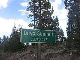 Onyx Summit is a mountain pass located in the San Bernardino Mountains in the southwestern part of San Bernardino County, California, United States. At an elevation of 8,443 ft. (2,573 m), it is the highest highway pass in Southern California. California State Route 38 traverses it at postmile 39.37 in the eastern part of San Bernardino National Forest.