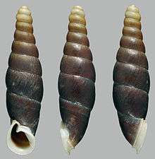 The shell is sinistral, not decollate, rather large, fusiform, solid, dark-brown, not translucent. Apical whorls are relatively broad. With 8-9 whorls, changing from apically moderately convex to somewhat flattened. Apical whorls are very finely, spirally punctated, the remaining ones with very fine, regular striae. The striae are rather faint above the aperture and not coarser on the neck. Suture is slightly indented. Neck is without a crest. Peristome is continuous, whitish, broadly reflexed and detached; basic margin more or less semicircular.[1]