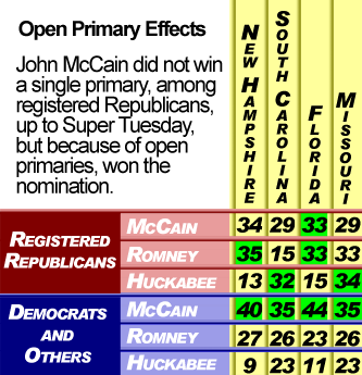 For example, in the 2008 presidential primaries, exit polls say John McCain failed to win a single race among Republican voters, up to Super Tuesday, yet during that same period he went from also-ran to front runner, because most non-Republicans who crossed over voted for him. In New Hampshire, Mitt Romney won among registered Republicans, but John McCain won overall . Likewise, in South Carolina, Mike Huckabee won among self-identified Republicans, but John McCain won the state .