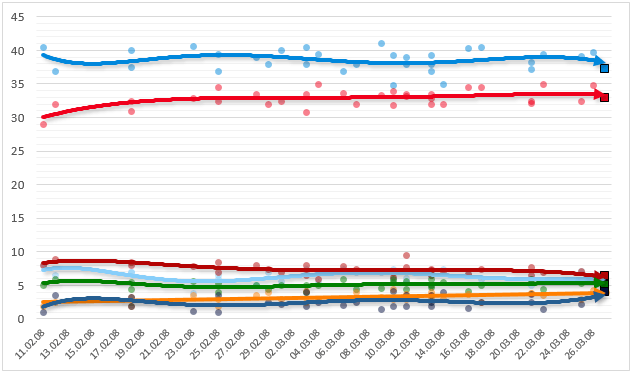 | 8–9 Mar | Digis | 33.4 | 41.1 | 7.0 | 7.1 | 4.6 | 3.3 | 1.5 | 2.0 | 7.7 |