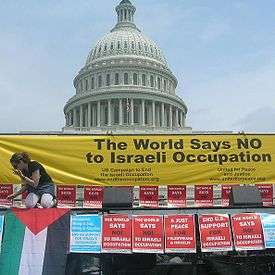 Opposition in the United States to the Israeli occupation is organized by hundreds of organizations, many of them members of the US Campaign to End the Israeli Occupation. These organizations include peace and anti-war, human rights and Arab- and Muslim-Americans groups.[1] Their tactics include education, protest, civil disobedience and lobbying.[2][3][4][5]