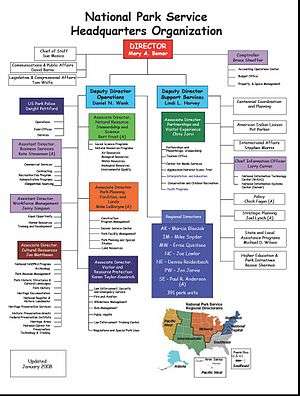 The National Park Service in the United States is a Bureau of the Department of the Interior with its headquarters located in Washington, D.C. The bureau consist of numerous support offices and seven regional offices, which oversee park operations within their geographic area.