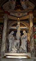 The shrine is flanked by the 14 marble Stations of the Cross, which depict Jesus' final hours before his death. Rather than the elements being carved from separate blocks of marble and assembled for each Station afterwards, each Station was sculpted from single blocks. The figures are depicted at life size. The Italian sculptor, Pepini, spent 14 years on the design and execution.[4]