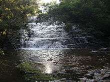 - Kumbakarai Falls located in the lower Palni foothills, along the Kodai-Vellagavi-Periyakulam foot path at . These falls have two stages. At the first stage water collects in huge rock recesses which are each named after wild animals such as tiger, elephant and snake. The Pambar river then flows .5 kilometres (0.31 mi) to the second stage before falling as the main waterfall.[23] Bathing is allowed. There is a bus from Periyakulam with fare of Rs. 5(6.00,7.00 13.00,15.30,16.30 hrs).