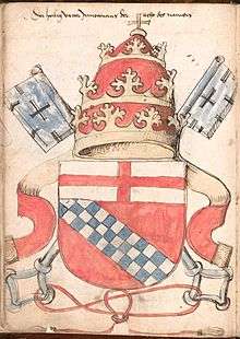 Papal coats of arms are the personal coat of arms of popes of the Catholic Church. These have been a tradition since the Late Middle Ages, and has displayed his own, initially that of his family, and thus not unique to himself alone, but in some cases composed by him with symbols referring to his past or his aspirations.[1][2][3] This personal coat of arms coexists with that of the Holy See.
