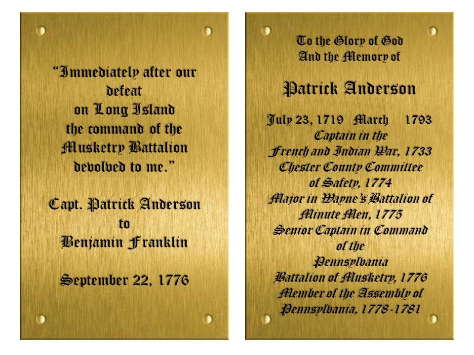 Patrick Anderson was the son of James Anderson, an early Scot (c. 1707) immigrant to Pennsylvania and Elizabeth Jerman (Jarman), the daughter of Thomas Jerman, a Welsh Quaker, who purchased one of William Penn’s first grist milling licenses (History of Tredyffrin Twp, PA ).