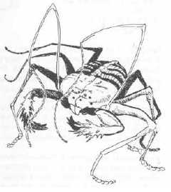 A pedipalp is a creature that resembles a cross between a spider and a scorpion, and is commonly called a whip scorpion. A pedipalp may be found in a variety of different colorings, with browns and tans being the most common. The large pedipalp has two grasping arms and mandibles for biting. The huge pedipalp has a pair of whip-like appendages in the place of one pair of legs, while another set of legs has spiny pincers on the ends. The giant pedipalp has a whip-like tail and forelegs that end in large pincers, and can discharge a noxious vapor.
