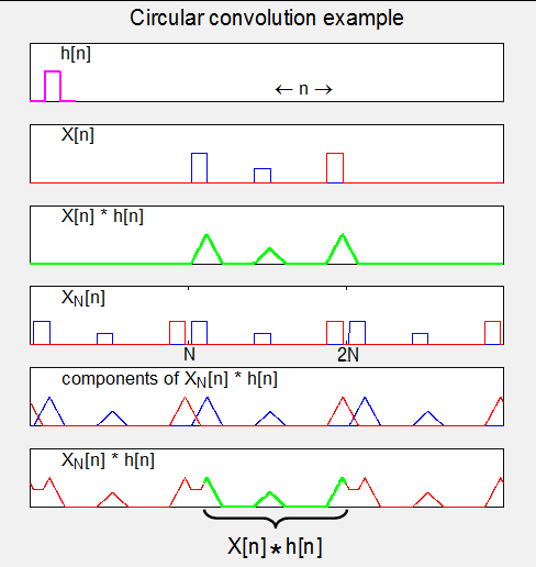 Similarly, for discrete sequences and period N, we can write the circular convolution of functions h and x as: