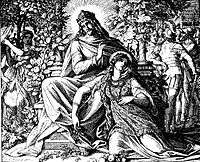 In the Talmud at Shab. 56b the rabbinical defenders of Solomon say that the sin ascribed to him in 1 Kings 11 “is only figurative: it is not meant that Solomon fell into idolatry, but that he was guilty of failing to restrain his wives from idolatrous practices.” The Jewish Encyclopedia points out that the opinion "prevalent in rabbinical literature is that Solomon lost his royalty, riches, and even his reason on account of his sins. This legend is based on the words 'I, Kohelet, was king over Israel in Jerusalem' (Eccl. i. 12, Hebr.), which show that when he uttered them he was no longer king. He gradually fell from the highest glory into the deepest misery. At first, Solomon reigned over the inhabitants of the upper world as well as over those of the lower; then only over the inhabitants of the earth; later over Israel only; then he retained only his bed and his stick; and finally his stick alone was left to him (Sanh. 20b)."[10] Rabbi Pinchas Frankel places the blame of this fall on Solomon's wife Pharaoh's daughter. He bemoans her arrival to Solomon's court for "Unlike Pharaoh's daughter in the Story of the Exodus, who raised and developed [Moses] the Leader of the People of Israel, this daughter of Pharaoh will have the opposite effect upon this Leader of Israel, causing his level of spirituality to fall to the point where he will have to temporarily abandon the kingship."[12]