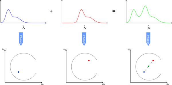 One of the interesting property of the phasor approach is the linearity where the superposition of different spectra or decay curves can be analyzed by vectorial superposition of individual phasors. This is demonstrated in the figure where adding two spectra with different emission maximum resulted in a phasor which falls on a line connecting the phasors of individual phasors. For a ternary system adding 3 spectra falls inside a triangle made by phasors of individual spectra or decays.