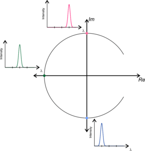 In Fluorescence lifetime and spectral imaging, phasor can be used to visualize the spectra and decay curves.[1][2] In this method the Fourier transformation of the spectrum or decay curve is calculated and the resulted complex number is plotted on a 2D plot where the X axis represents the Real component and the Y axis represents the Imaginary component. This facilitate the analysis since each spectrum and decay is transformed into a unique position on the phasor plot which depends on its spectral width or emission maximum or to its average lifetime. The most important feature of this analysis is that it is fast and it provides a graphical representation of the measured curve.