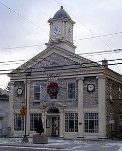 Phelps Town Hall is a historic town hall located at Phelps in Ontario County, New York. It was built in 1849 and remodeled in 1912-1913. It is architecturally significant as a Greek Revival style town hall with distinguished Neoclassical style modifications. It features an elegant clock tower with paired, fluted Corinthian columns.[2]