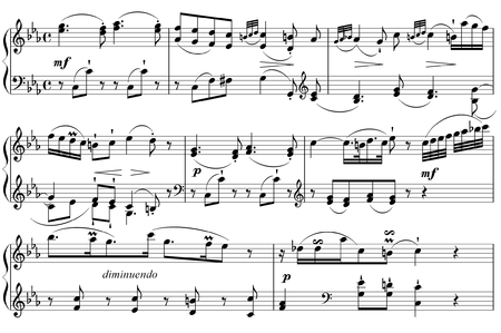 The second movement, marked "andante con moto", is in A-flat major and 3/4 time, and features multiple passages of syncopation.[3]