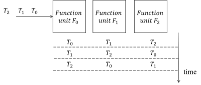 Pipelining allows different functional units of a system to run concurrently. Consider an informal example in the following figure. A system includes three sub-function units (F0, F1 and F2). Assume that there are three independent tasks (T0, T1 and T2) being performed by these three function units. The time for each function unit to complete a task is the same and will occupy a slot in the schedule.
