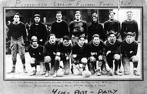 The Pittsburgh Lyceum were a professional football team based in Pittsburgh, Pennsylvania from 1906[1] until 1910. The team played against many of the top "Ohio League", the most notables being the Canton Bulldogs and the Massillon Tigers.[2] They were regarded as one of the top professional football teams in Pittsburgh from 1907 until the mid-1920s. The Lyceum was also the last pro football championship team Pittsburgh would produce until the 1970s. Many of their victories came against many of the strongest teams in Pennsylvania, West Virginia, and Ohio. Hence, they were given the mythical moniker the "Tri-State Champions" in 1909. The team was finally defeated in 1909, via an upset by the Dayton Oakwoods in their final game of 1909. The Lyceums broke up after a disappointing 1910 season.[3] An incarnation of the team existed in 1924. Art Rooney, who would go on establish the Pittsburgh Steelers and become enshrined in the Pro Football Hall of Fame, played for the Lyceum.[4]