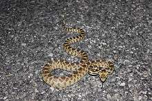 The Great Basin gopher snake is a great climber, swimmer, and burrower. It is one of the most commonly found snakes when people are hiking or driving on the road. They are easily seen in spring when the male snakes are out and about trying to find a mate. The hatchlings are easily found in late August and September when they emerge from their eggs. Like most animals, Great Basin gopher snakes are not dangerous unless provoked. When defending themselves from predators, they will elevate and inflate the body, and flatten the head into a triangular shape. Loud hissing noises will ensue, along with quick shaking of the tail, mimicking the sound of a deadly rattlesnake. Unlike a rattlesnake, however, the Great Basin gopher snake is nonvenomous.[6]